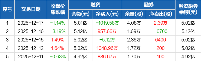 浦东建设:融资净偿还1019.58万元,融资余额5.01亿元(12-17)