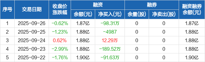 酒钢宏兴:融资净偿还98.31万元,融资余额1.87亿元(09-26)
