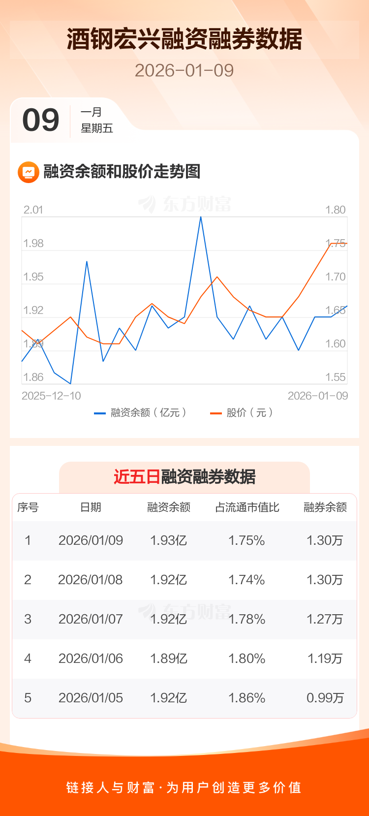 交易所最新数据显示,酒钢宏兴于2026年1月9日获融资买入1471.90万元,融资偿还1347.84万元,当日融资净买入124.06万元。目前,该股融资余额1.93亿,占流通市值比例为1.75%。