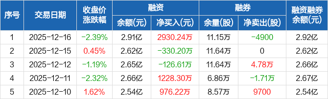融资方面,当日融资买入4754.17万元,融资偿还1823.93万元,融资净买入2930.24万元。融券方面,融券卖出200股,融券偿还5100股,融券余量11.15万股,融券余额72.92万元。融资融券余额合计2.92亿元。