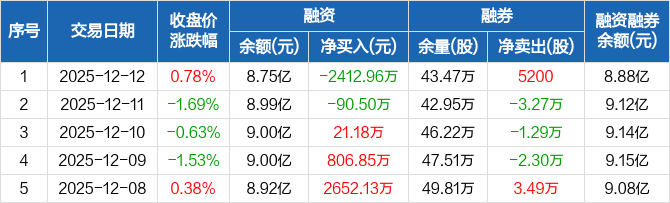 洪都航空:融资净偿还2412.96万元,融资余额8.75亿元(12-12)