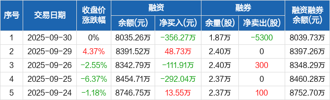 津投城开:融资净偿还356.27万元,融资余额8035.26万元(09-30)