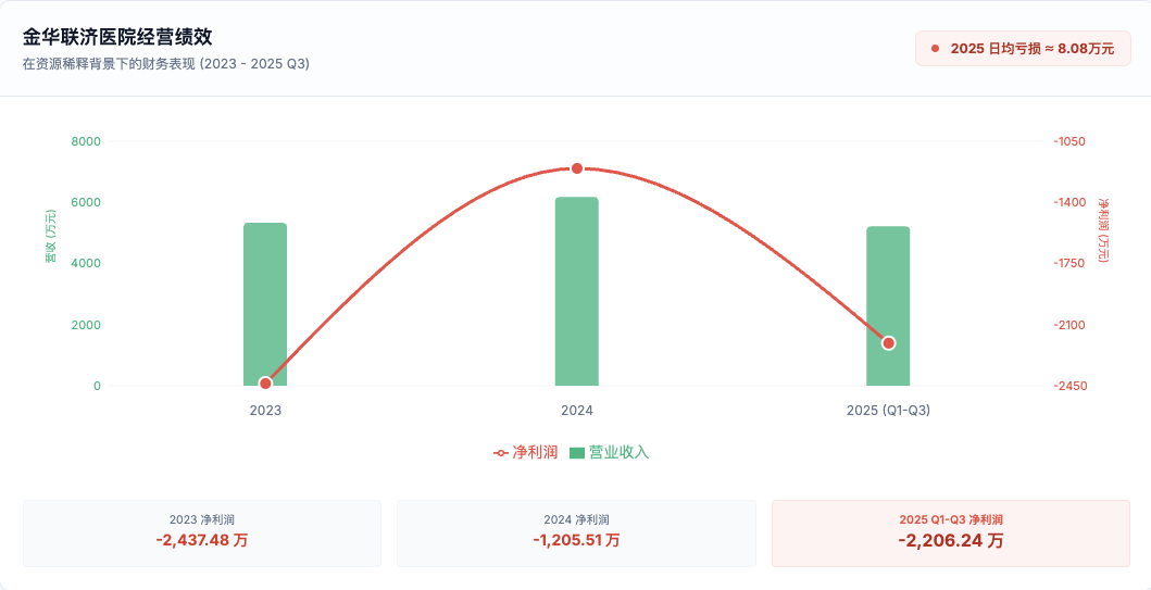 据公告,2023年、2024年、2025年前三季度,金华联济医院实现营业收入5334.23万元、6177.73万元、5215.28万元,实现净利润-2437.48万元、-1205.51万元、-2206.24万元。即金华联济医院2025年前三季度平均每天亏约8.08万元。