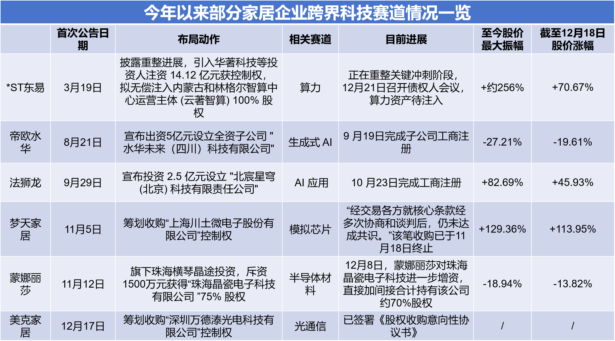 梦天家居不是个例,自公司跨界信息披露以来,*ST东易、法狮龙等公司股价也出现大幅上涨,股价最大涨幅达256%、82%。不过,也有公司股价并未因此进入上行通道。截至2025年12月18日,帝欧水华、蒙娜丽莎的股价较信息披露日下降超19%、13%。