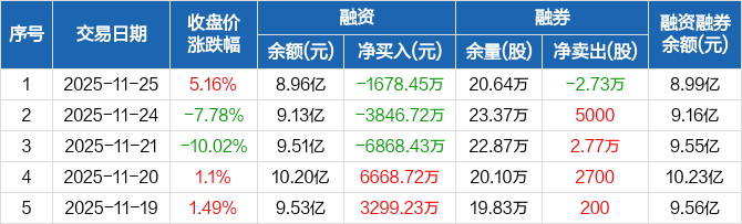 融资方面,当日融资买入1.2亿元,融资偿还1.37亿元,融资净偿还1678.45万元,连续3日净偿还累计1.24亿元。融券方面,融券卖出5300股,融券偿还3.26万股,融券余量20.64万股,融券余额298.45万元。融资融券余额合计8.99亿元。