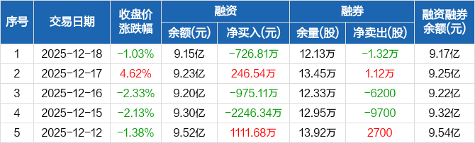 西藏珠峰:融资净偿还726.81万元,融资余额9.15亿元(12-18)