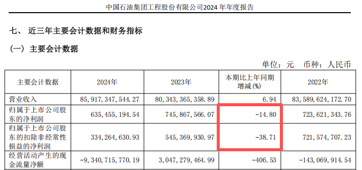 2024年,中油工程的营业收入同比增长6.94%至859.17亿元,归母净利润同比下降14.80%至6.35亿元,扣非后净利润同比下降38.71%至3.34亿元。