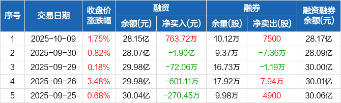 恒力石化:融资净买入763.72万元,融资余额28.15亿元(10-09)