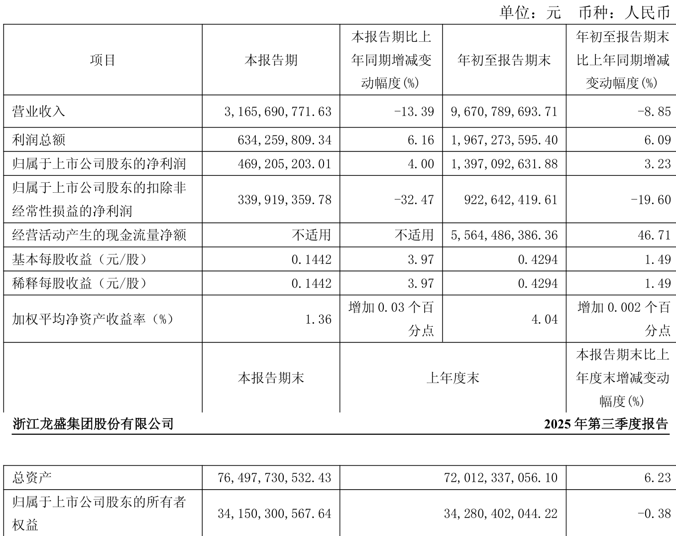 中证智能财讯浙江龙盛(600352)10月29日披露2025年第三季度报告。前三季度公司实现营业总收入96.71亿元,同比下降8.85%;归母净利润13.97亿元,同比增长3.23%;扣非净利润9.23亿元,同比下降19.60%;经营活动产生的现金流量净额为55.64亿元,同比增长46.71%;报告期内,浙江龙盛基本每股收益为0.4294元,加权平均净资产收益率为4.04%。