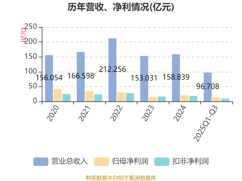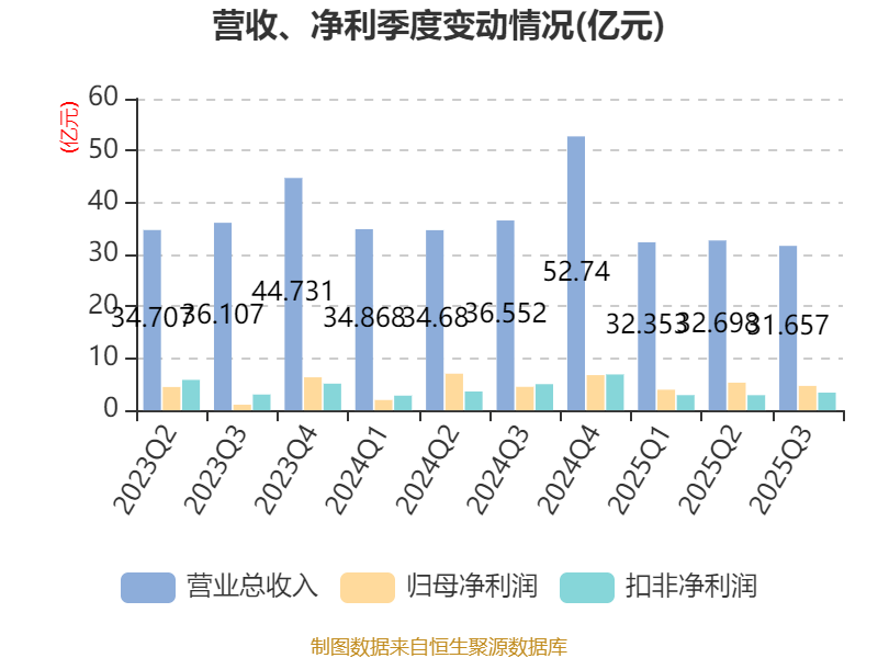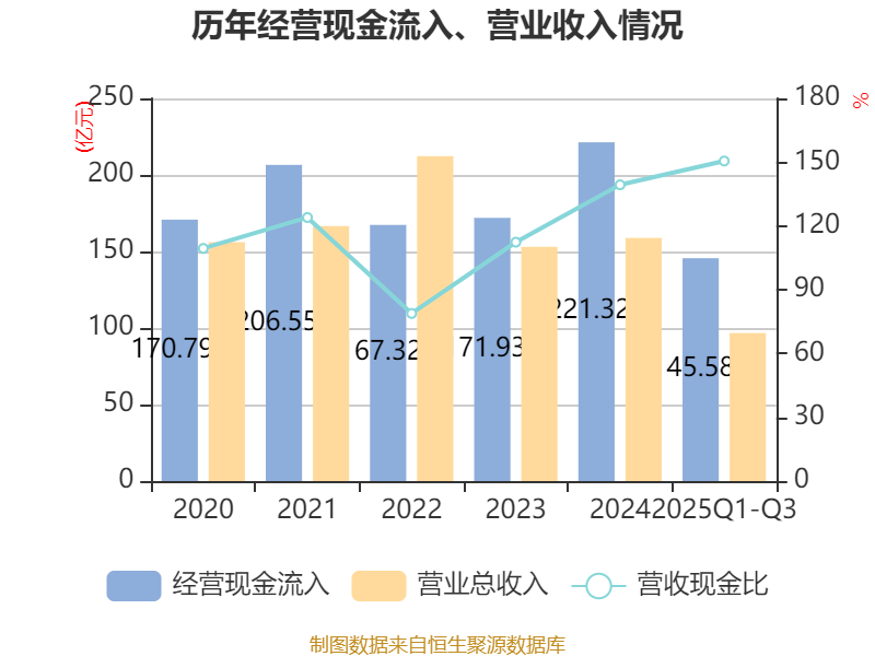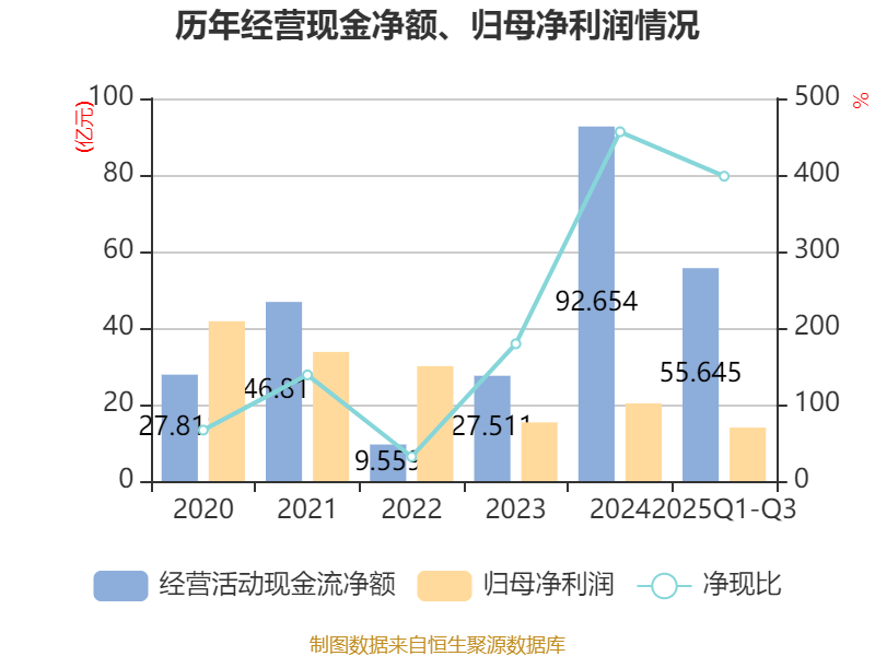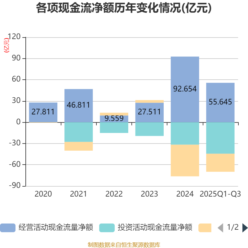 2025年前三季度,公司经营活动现金流净额为55.64亿元,同比增长46.71%;筹资活动现金流净额-25.47亿元,同比减少52.51亿元;投资活动现金流净额-44.42亿元,上年同期为-44.23亿元。