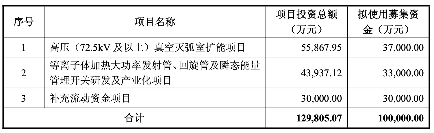 等离子体加热大功率发射管、回旋管及瞬态能量管理开关研发及产业化项目总投资额为4.39亿元,拟使用募集资金3.3亿元(含本数)。该项目分多个子项目建设,建设期为24~48个月。