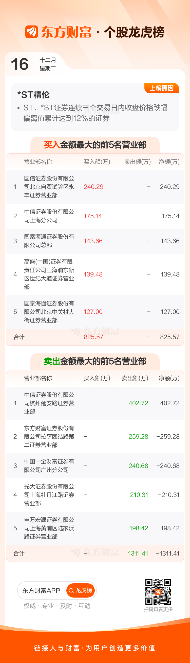 交易所2025年12月16日公布的交易公开信息显示,*ST精伦因成为ST、*ST证券连续三个交易日内收盘价格跌幅偏离值累计达到12%的证券上榜。*ST精伦当日收报2.22元,涨跌幅-5.13%,换手率0.31%,成交额340.93万。异常期间12月12日至12月16日,期间涨幅-13.28%,累计偏离值-12.03%,区间成交额5876.84万。