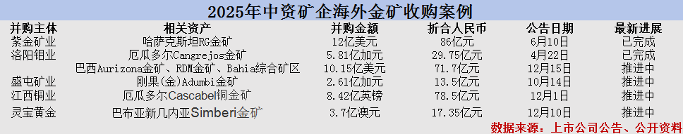 今年不断创出新高的金价,也吸引了更多的企业加大投资,仅今年12月便已经有江西铜业(600362.SH)、灵宝黄金(3330.HK)和洛阳钼业(603933.SH)三家中资企业宣布收购海外黄金矿山等资产