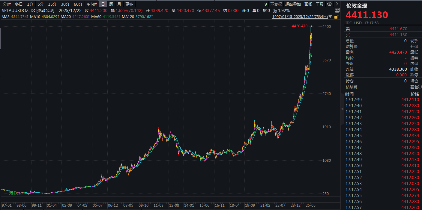 12月22日,国际金价续创历史新高。截至发稿前,伦敦金现货已经超越今年10月高点,最高价达到4420美元/盎司,年内涨幅进一步扩大至68%左右。