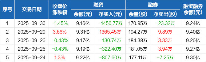 西南证券:融资净偿还1456.77万元,融资余额9.16亿元(09-30)