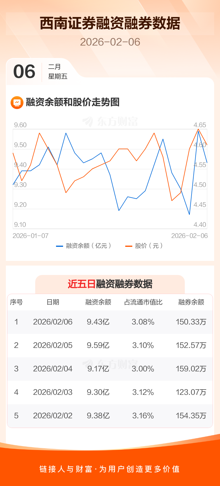 交易所最新数据显示,西南证券于2026年2月6日获融资买入1997.92万元,融资偿还3571.03万元,当日融资净偿还1573.11万元。目前,该股融资余额9.43亿,占流通市值比例为3.08%。