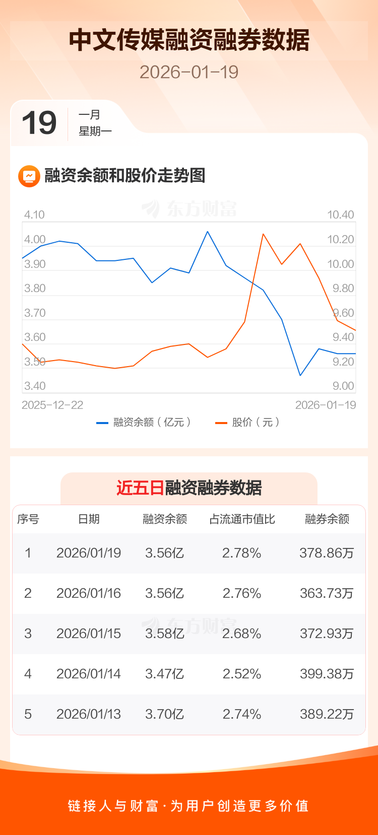 交易所最新数据显示,中文传媒于2026年1月19日获融资买入1614.37万元,融资偿还1661.38万元,当日融资净偿还47万元。目前,该股融资余额3.56亿,占流通市值比例为2.78%。