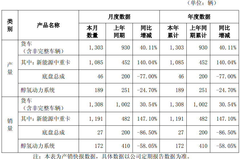 汉马科技1月货车产、销量同比双增