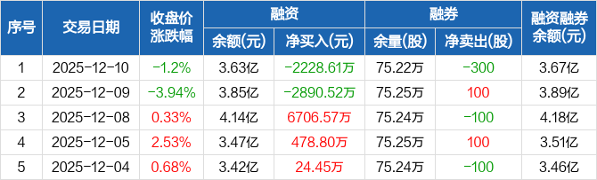 融资方面,当日融资买入5831.16万元,融资偿还8059.77万元,融资净偿还2228.61万元。融券方面,融券卖出0股,融券偿还300股,融券余量75.22万股,融券余额434.77万元。融资融券余额合计3.67亿元。
