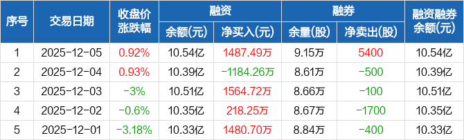 融资方面,当日融资买入6437.38万元,融资偿还4949.89万元,融资净买入1487.49万元。融券方面,融券卖出5900股,融券偿还500股,融券余量9.15万股,融券余额30.1万元。融资融券余额合计10.54亿元。