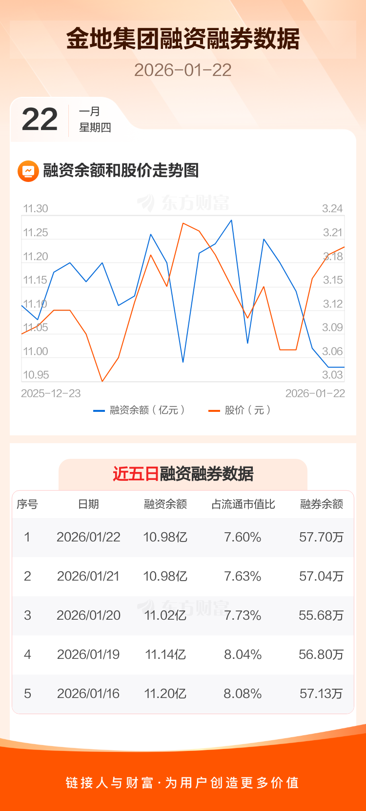 交易所最新数据显示,金地集团于2026年1月22日获融资买入3107.37万元,融资偿还3351.44万元,当日融资净偿还244.07万元。目前,该股融资余额10.98亿,占流通市值比例为7.60%。