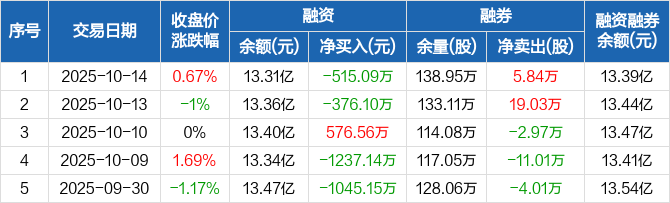 五矿资本:融资净偿还515.09万元,融资余额13.31亿元(10-14)