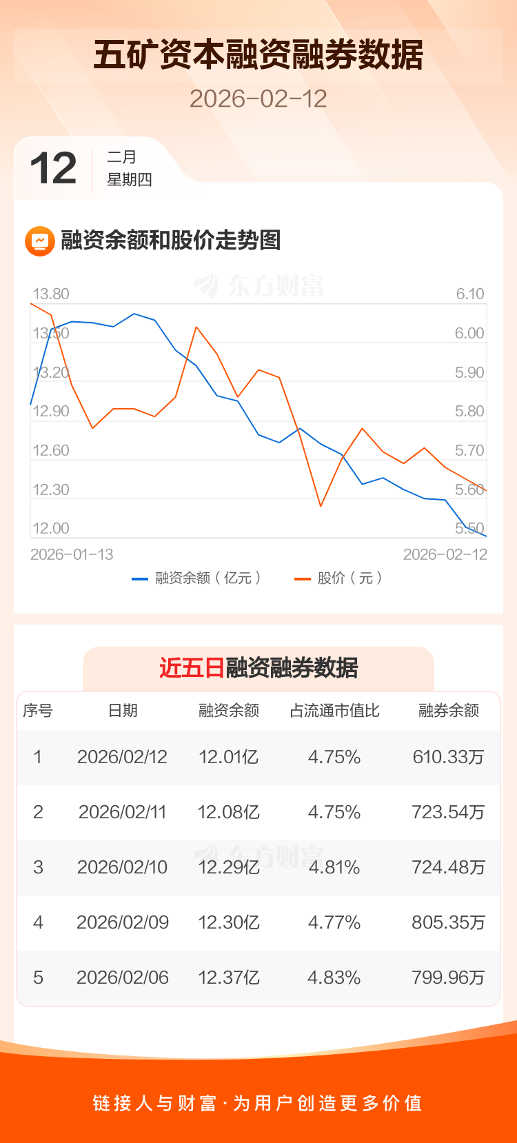 交易所最新数据显示,五矿资本于2026年2月12日获融资买入1664.50万元,融资偿还2308.96万元,当日融资净偿还644.46万元。目前,该股融资余额12.01亿,占流通市值比例为4.75%。