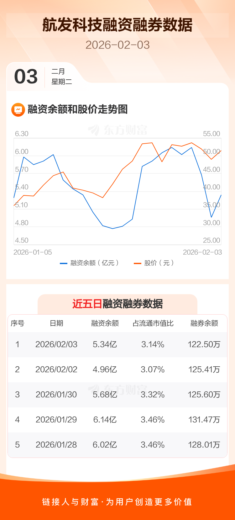交易所最新数据显示,航发科技于2026年2月3日获融资买入1.22亿元,融资偿还8424.92万元,当日融资净买入3751.41万元。目前,该股融资余额5.34亿,占流通市值比例为3.14%。