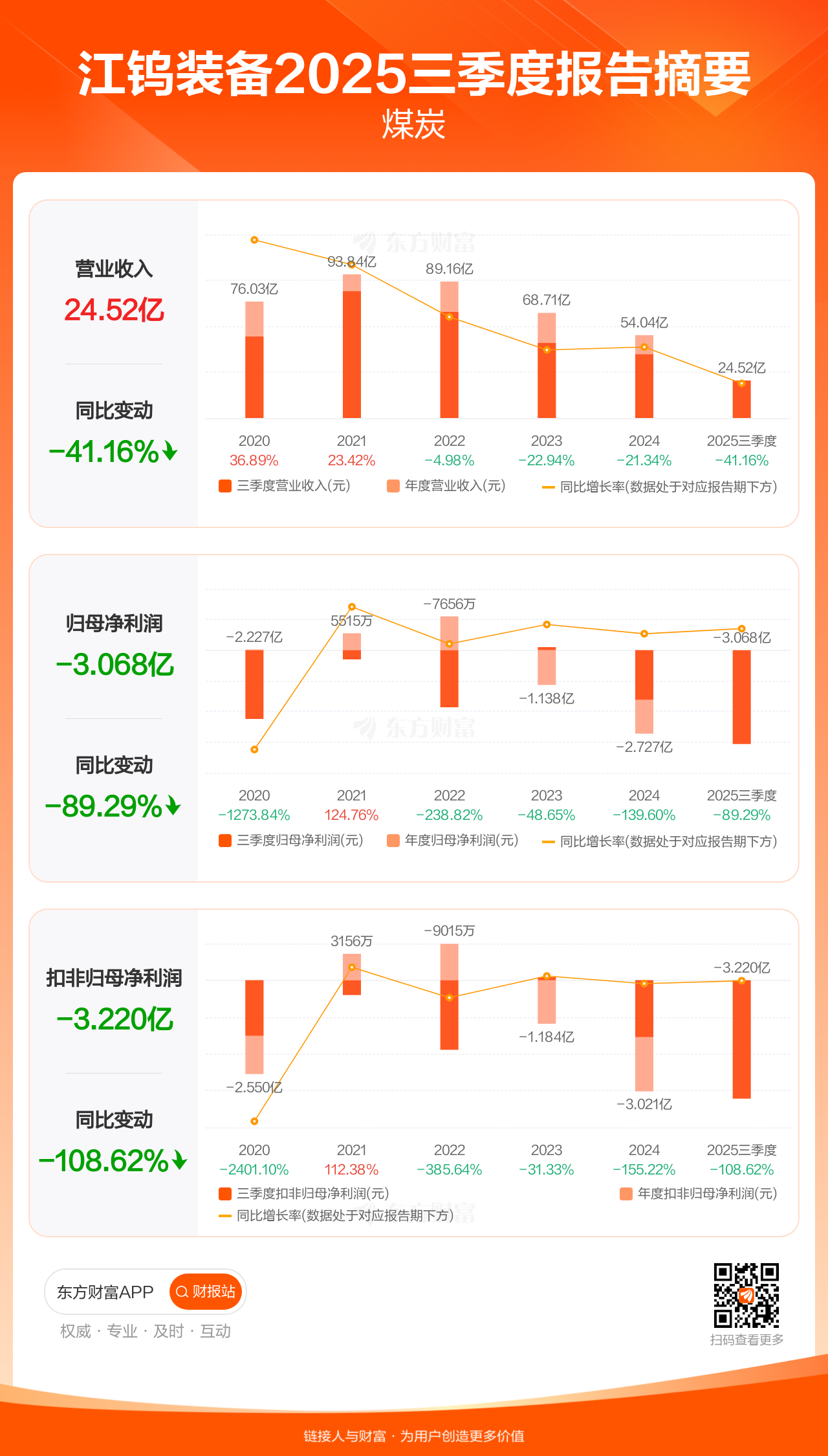 江钨装备10月29日发布2025年三季报显示,公司前三季实现营业收入24.52亿元,同比下滑41.16%;归母净利润-3.07亿元;扣非归母净利润-3.22亿元。