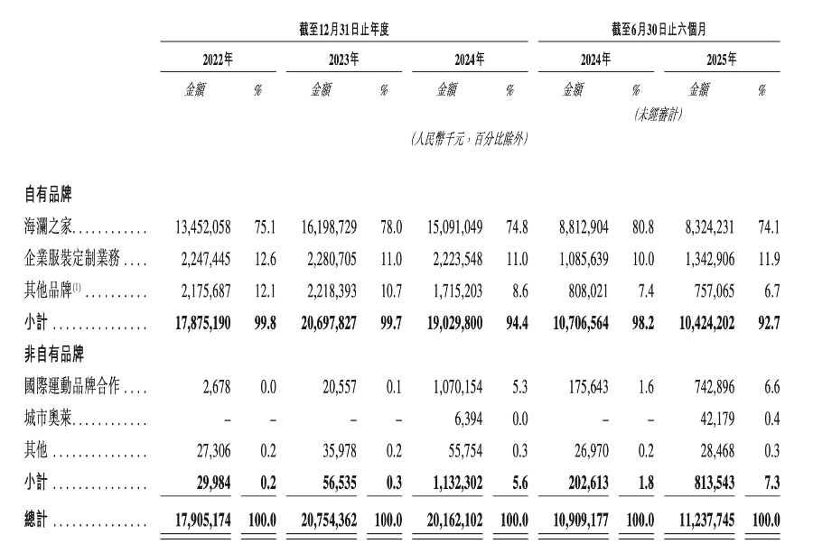 相比之下,包括轻奢女装品牌OVV、高端婴童装品牌英氏、海澜优选等在内的其他品牌,收入贡献尚不成气候,2022年-2024年及2025年上半年收入贡献比重分别为12.1%、10.7%、8.6%及6.7%。