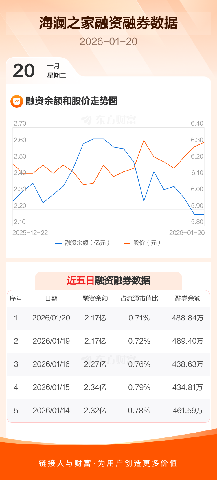 交易所最新数据显示,海澜之家于2026年1月20日获融资买入1327.25万元,融资偿还1322.62万元,当日融资净买入4.63万元。目前,该股融资余额2.17亿,占流通市值比例为0.71%。