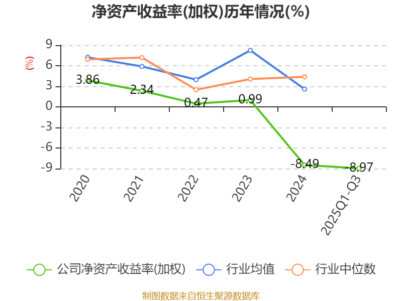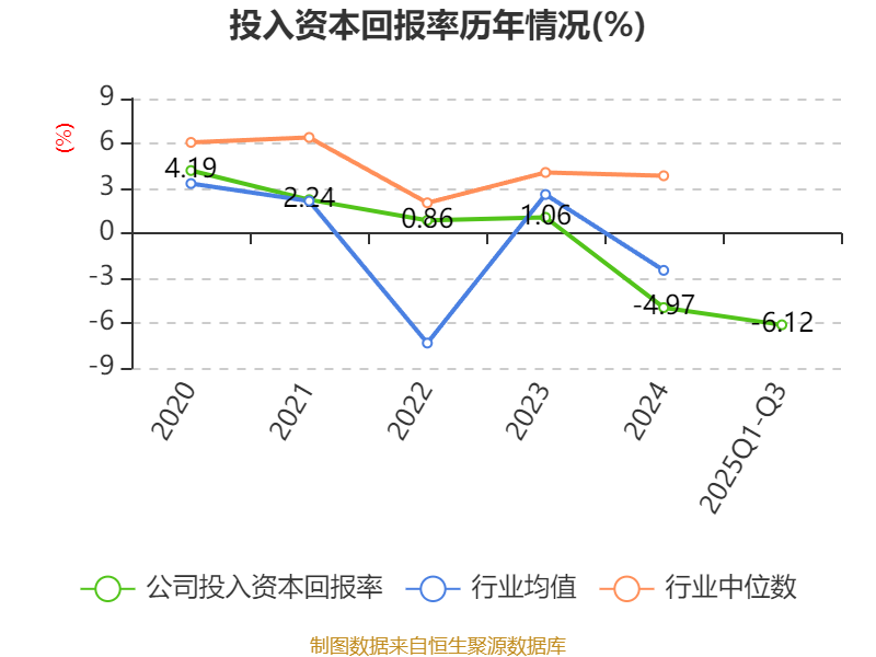 盈利能力方面, 2025年前三季度公司加权平均净资产收益率为-8.97%,同比下降9.08个百分点。公司2025年前三季度投入资本回报率为-6.12%,较上年同期下降6.33个百分点。