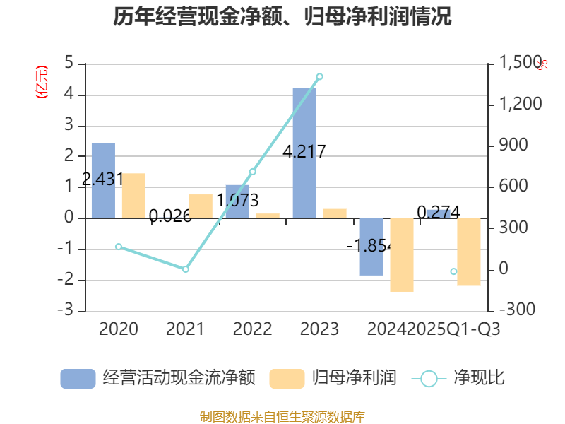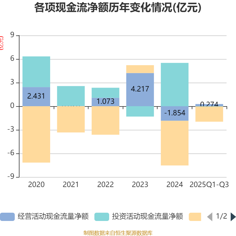 2025年前三季度,公司经营活动现金流净额为2739.29万元,同比增加3.15亿元;筹资活动现金流净额-1.94亿元,同比增加2.45亿元;投资活动现金流净额-337.65万元,上年同期为4.92亿元。