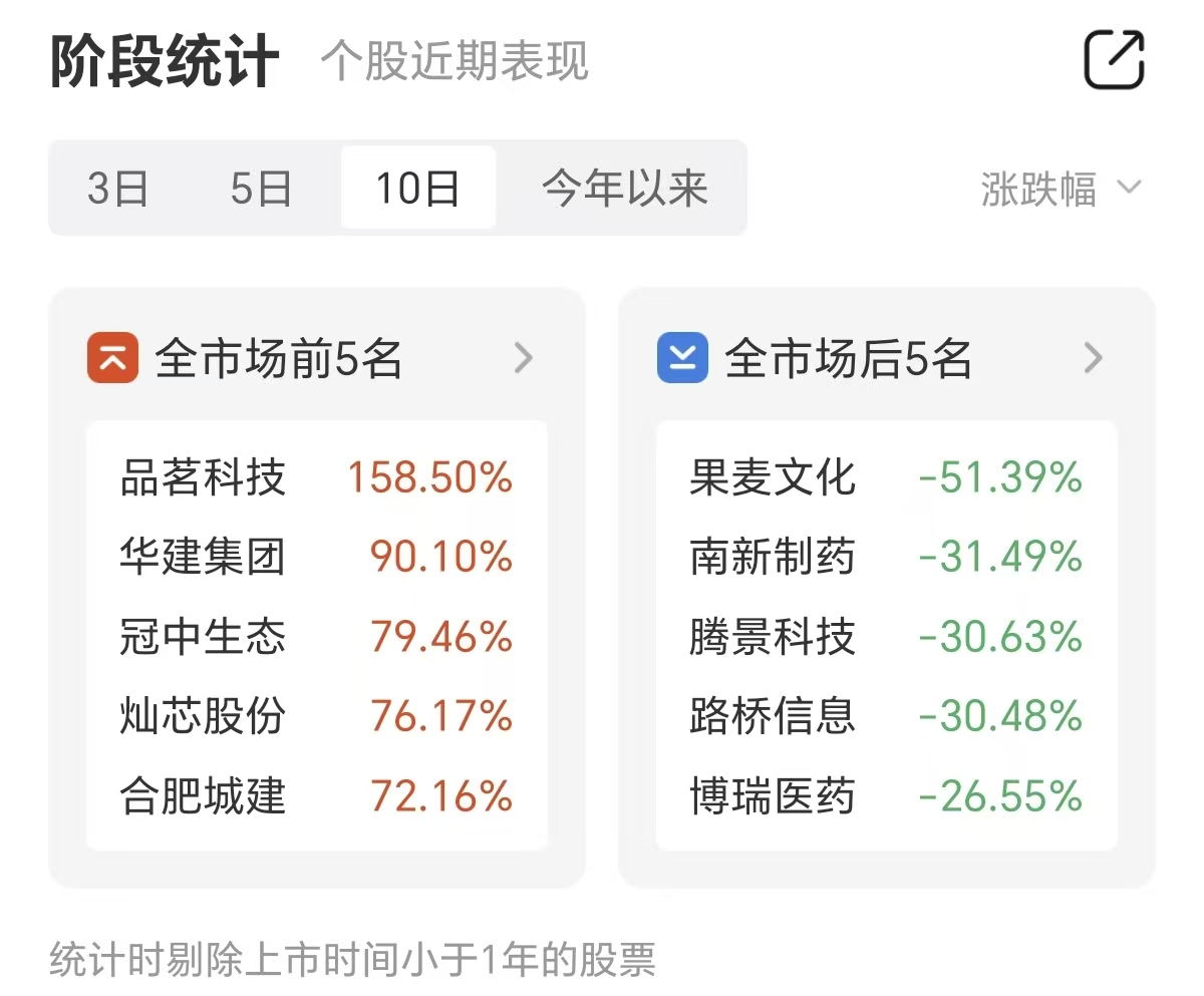 与此同时,近十个交易日涨幅前五名的个股分别为品茗科技、华建集团、冠中生态、灿芯股份、合肥城建。
