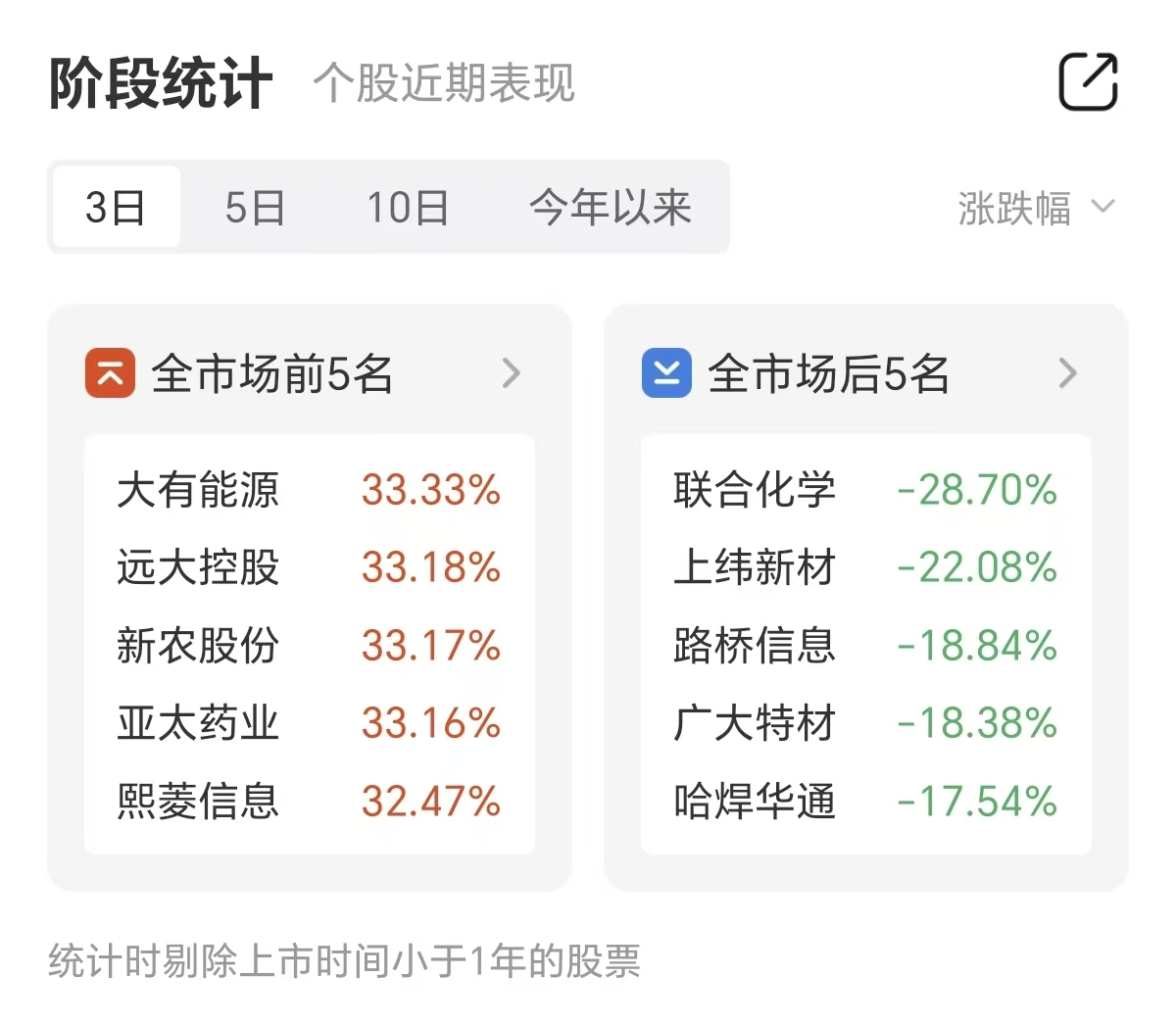 周四市场全天冲高回落,A股全市场涨幅前五名分别为大有能源、远大控股、新农股份、亚太药业、熙菱信息,其中大有能源三日涨幅达33.33%,位列涨幅榜第一。