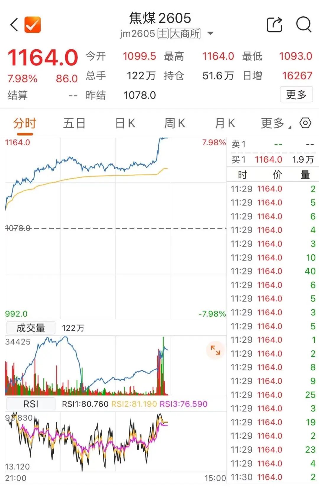 消息面上,大商所焦煤主力合约触及涨停,报1164元/吨,现涨幅为7.98%。