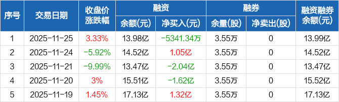 融资方面,当日融资买入3.21亿元,融资偿还3.74亿元,融资净偿还5341.34万元。融券方面,融券卖出0股,融券偿还0股,融券余量3.55万股,融券余额69.33万元。融资融券余额合计13.99亿元。