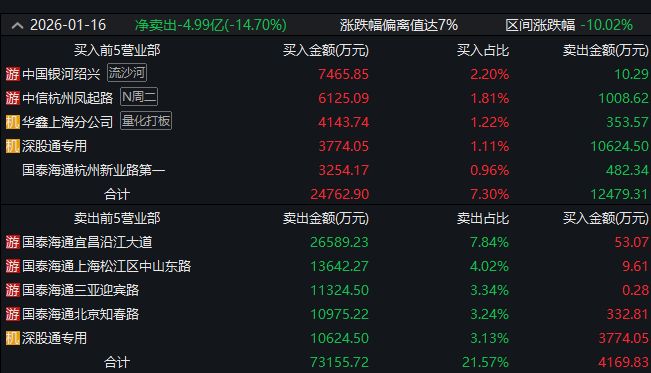 1月16日,华胜天成龙虎榜数据显示,“陈小群”所在的中国银河证券大连黄河路营业部卖出5.13亿元,实际上华胜天成的股价于1月14日涨停。1月15日公司股价直接一字板涨停。盘后龙虎榜显示,1月15日,上述席位买入5.42亿元。