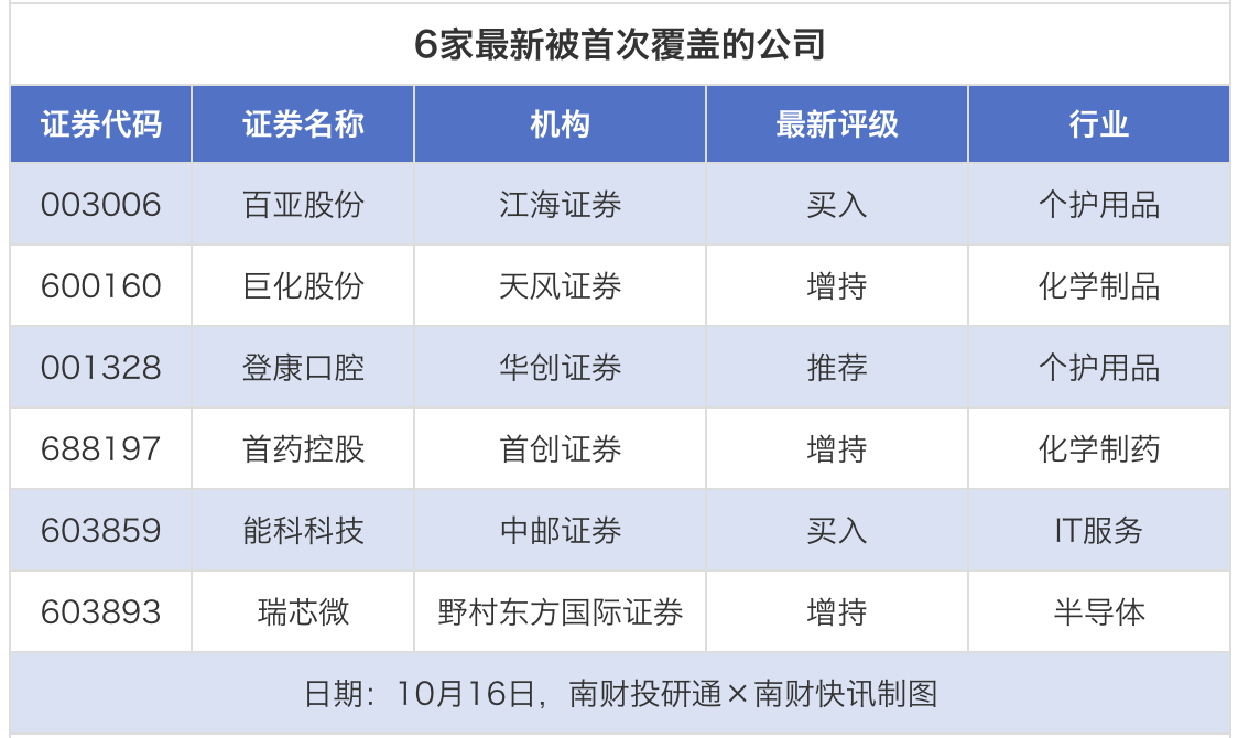 首次覆盖方面,10月16日券商共给出了6次首次覆盖,其中百亚股份获得江海证券给予“买入”评级,巨化股份获得天风证券给予“增持”评级,登康口腔获得华创证券给予“推荐”评级,首药控股获得首创证券给予“增持”评级,能科科技获得中邮证券给予“买入”评级。