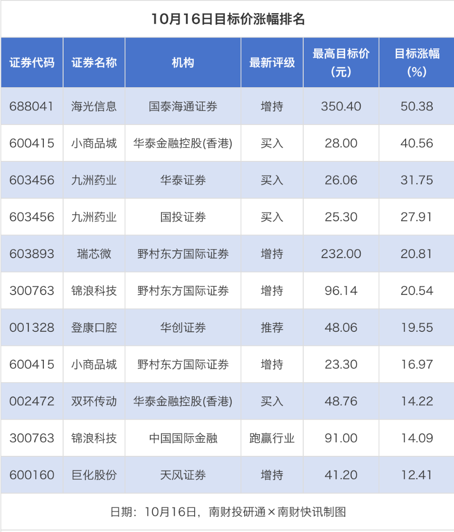 南财投研通数据显示,10月16日,券商给予上市公司目标价共11次,按最新收盘价计算,目标价涨幅排名居前的公司有海光信息、小商品城、九洲药业,目标价涨幅分别为50.38%、40.56%、31.75%,分别属于半导体、一般零售、医疗服务行业。