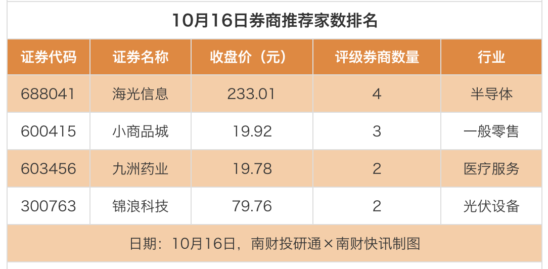 从券商推荐家数来看,10月16日有20家上市公司得到券商推荐,其中海光信息获得4家推荐,小商品城获得3家推荐,九洲药业获得2家推荐。