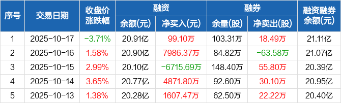 融资方面,当日融资买入9577.64万元,融资偿还9478.54万元,融资净买入99.1万元。融券方面,融券卖出26.69万股,融券偿还8.2万股,融券余量103.31万股,融券余额1981.49万元。融资融券余额合计21.11亿元。