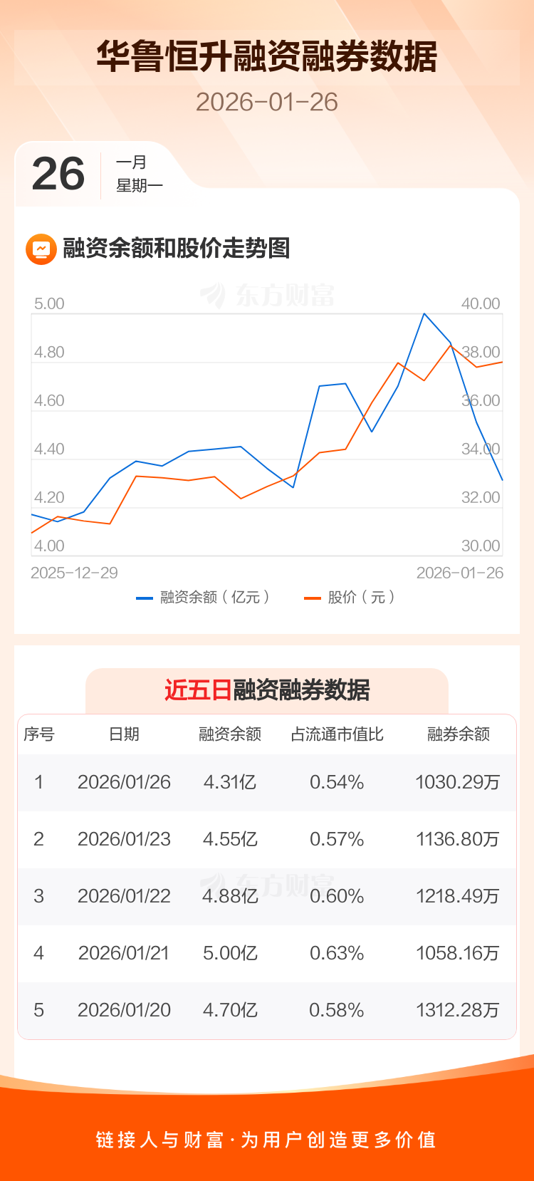 交易所最新数据显示,华鲁恒升于2026年1月26日获融资买入7564.47万元,融资偿还1.00亿元,当日融资净偿还2443.48万元。目前,该股融资余额4.31亿,占流通市值比例为0.54%。