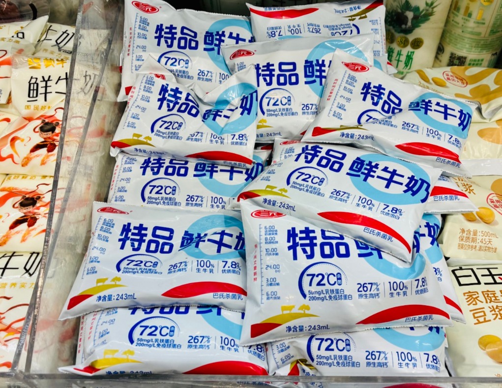 界面新闻走访超市渠道发现,北京市场的低温牛奶以伊利、蒙牛、三元、君乐宝为主,此外还包括零售卖场推出的自有品牌低温牛奶,少量渠道也有优诺、塞上一头牛、新乳业今日鲜奶铺等产品,此前光明在北京市场大量铺货的“新鲜牧场”牛奶在永辉、盒马、京客隆北京门店都无法找到。永辉一名工作人员告诉界面新闻,2.6元一袋的三元鲜牛奶(243毫升)几乎每天都会售罄,“这款产品已经卖了十多年,价格实惠,北京消费者较为认可。”