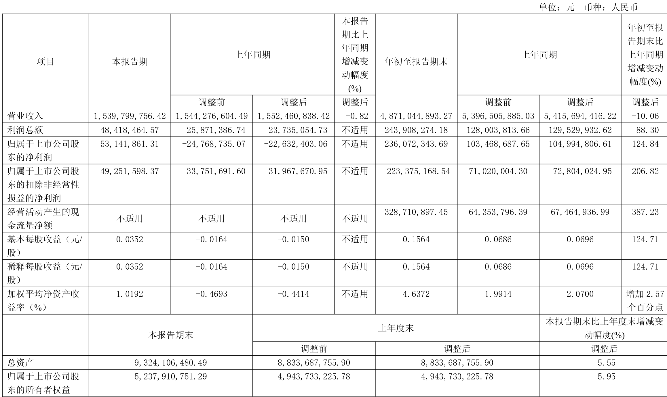 中证智能财讯三元股份(600429)10月29日披露2025年第三季度报告。前三季度公司实现营业总收入48.71亿元,同比下降10.06%;归母净利润2.36亿元,同比增长124.84%;扣非净利润2.23亿元,同比增长206.82%;经营活动产生的现金流量净额为3.29亿元,同比增长387.23%;报告期内,三元股份基本每股收益为0.1564元,加权平均净资产收益率为4.64%。