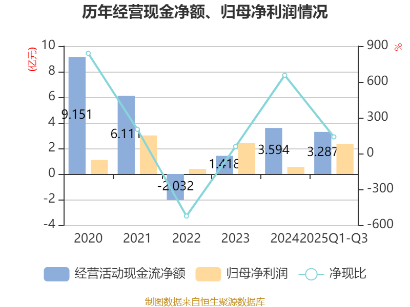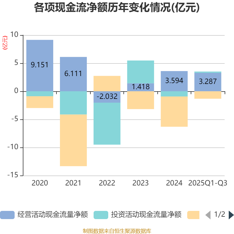 2025年前三季度,公司经营活动现金流净额为3.29亿元,同比增长387.23%;筹资活动现金流净额-1.33亿元,同比减少41.68万元;投资活动现金流净额2226.01万元,上年同期为-2.02亿元。
