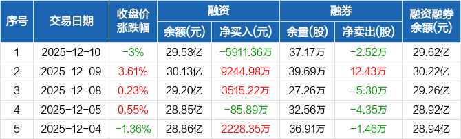 融资方面,当日融资买入2.04亿元,融资偿还2.63亿元,融资净偿还5911.36万元。融券方面,融券卖出2.95万股,融券偿还5.47万股,融券余量37.17万股,融券余额817.74万元。融资融券余额合计29.62亿元。
