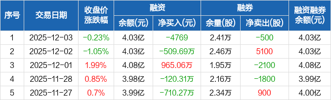 时代新材:融资净偿还4769元,融资余额4.03亿元(12-03)