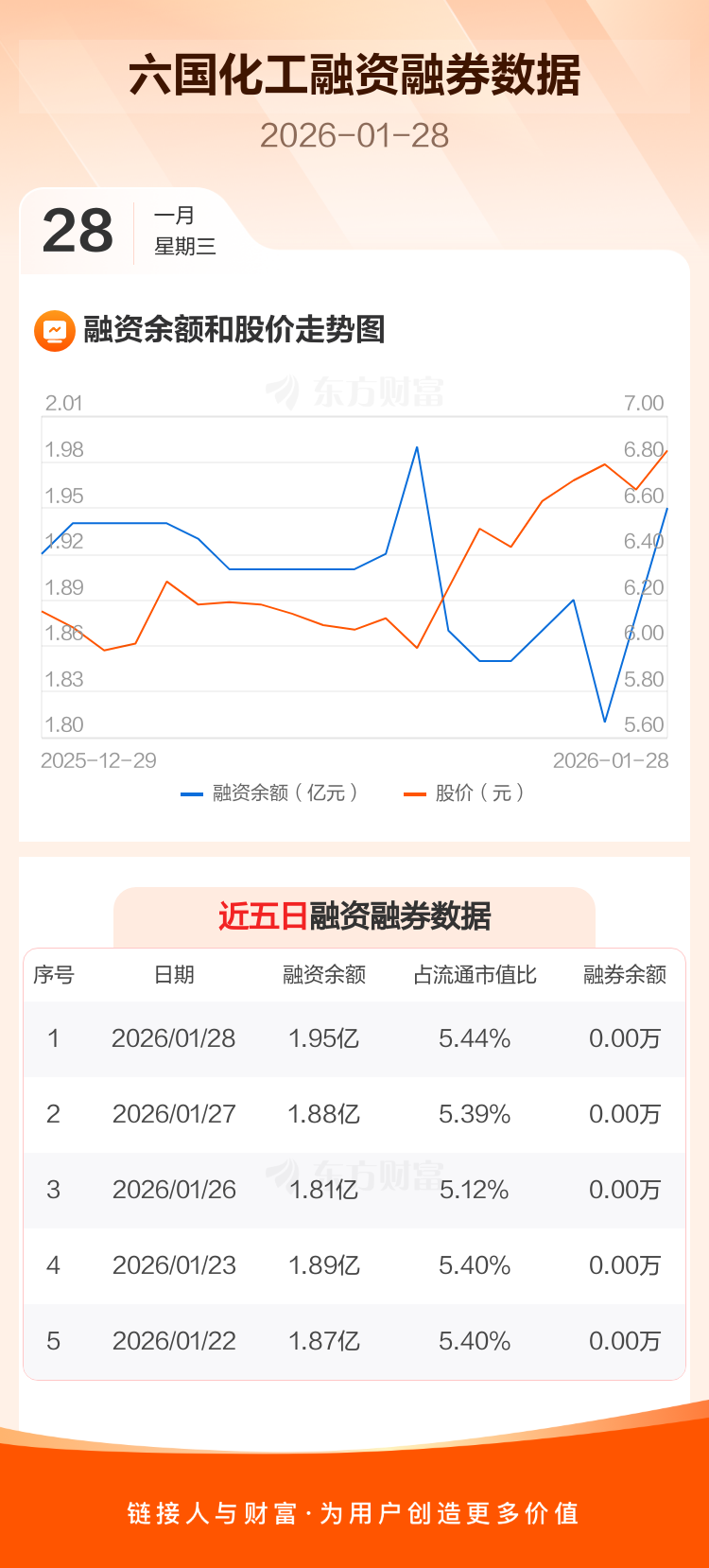 交易所最新数据显示,六国化工于2026年1月28日获融资买入2097.27万元,融资偿还1431.63万元,当日融资净买入665.64万元。目前,该股融资余额1.95亿,占流通市值比例为5.44%。