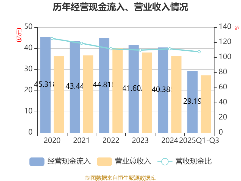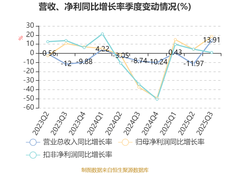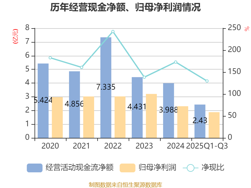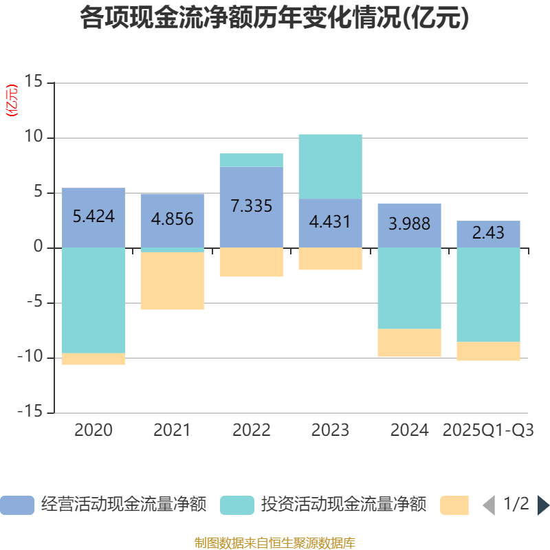 2025年前三季度,公司经营活动现金流净额为2.43亿元,同比增长394.87%;筹资活动现金流净额-1.7亿元,同比增加5642.11万元;投资活动现金流净额-8.59亿元,上年同期为-2775.45万元。